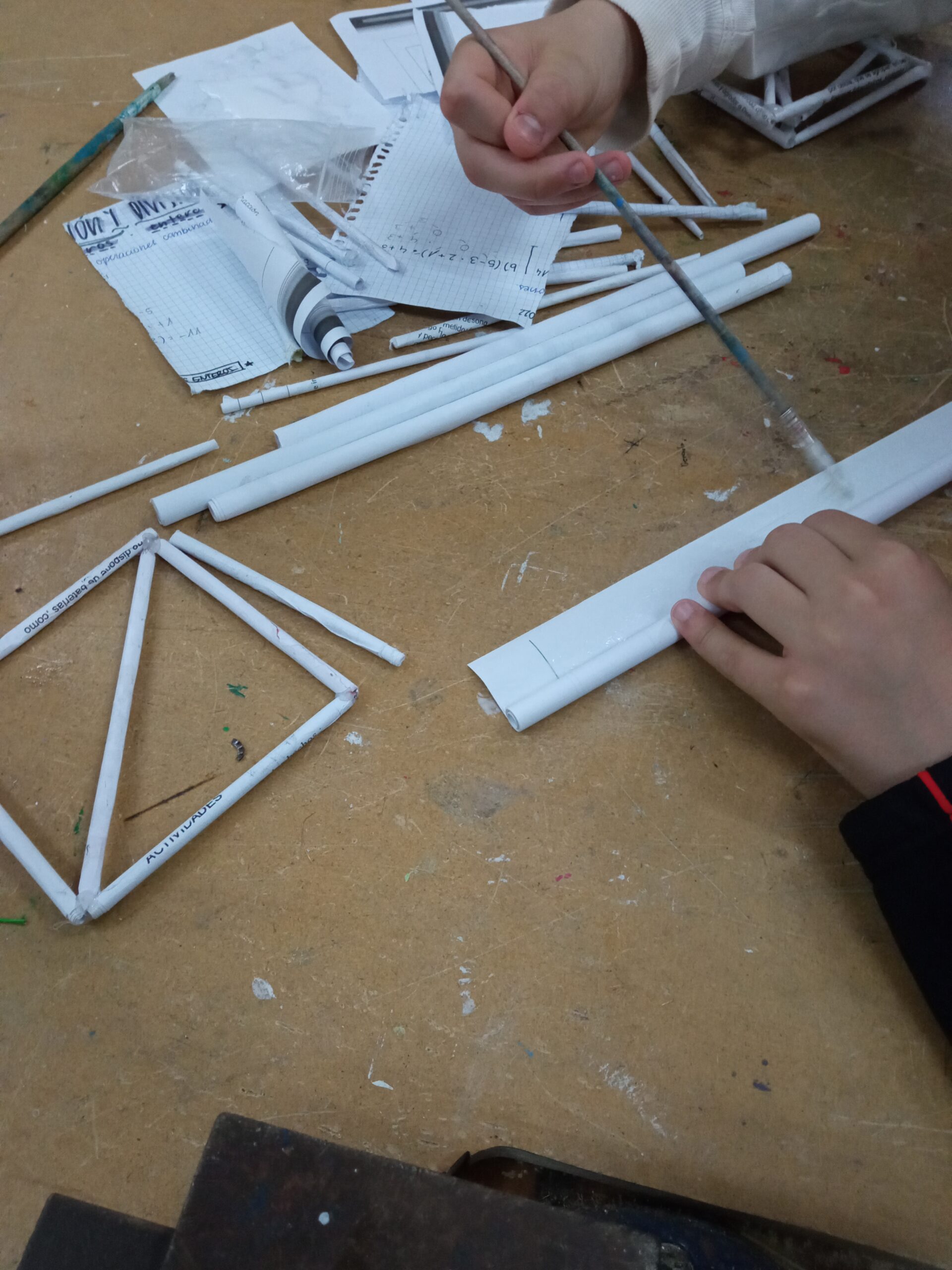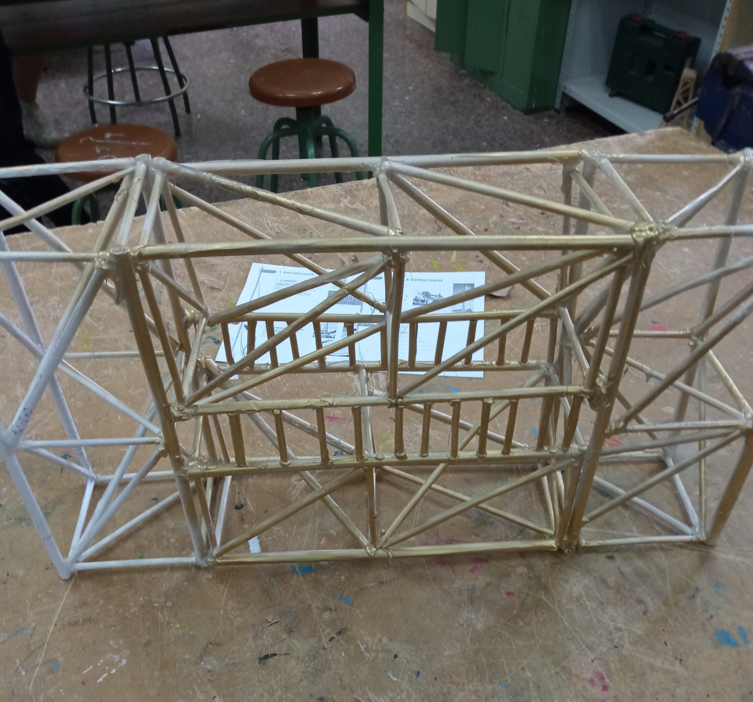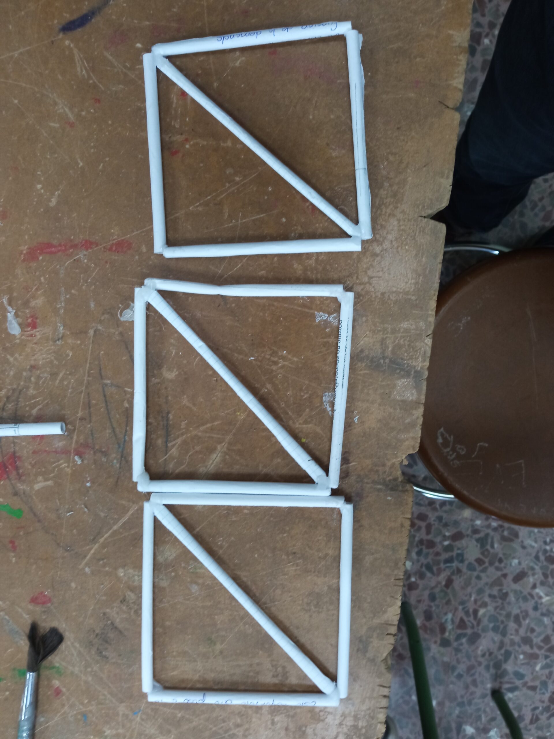 2. Construimos, utilizando la pistola de termofusible, las estructuras básicas en cuadrado y añadimos una triangulación.