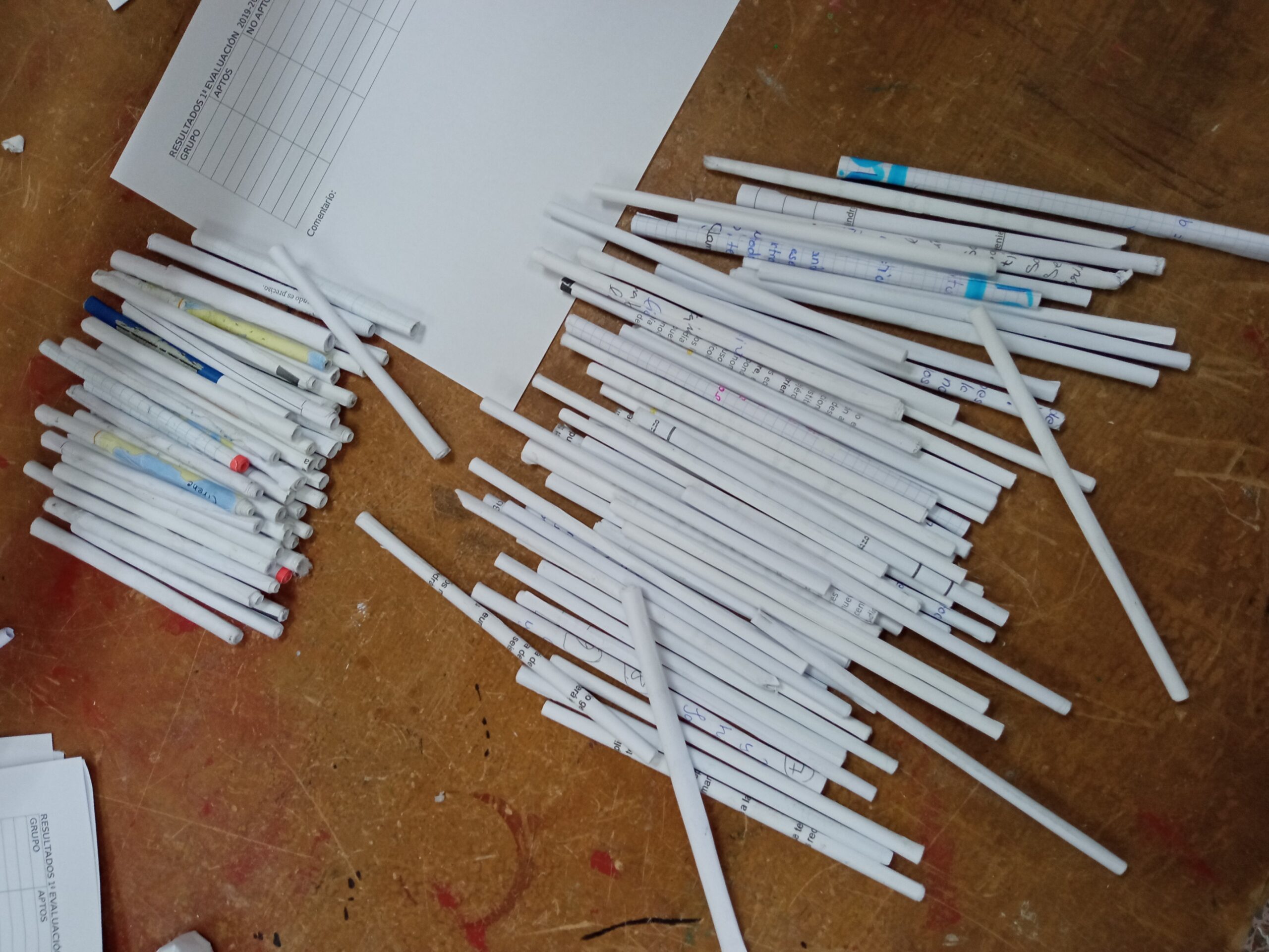 1. Enrollamos el papel en tubos (de los diferentes tamaños necesarios). Lo pegaremos con cola blanca, ayudándonos con un pincel.
